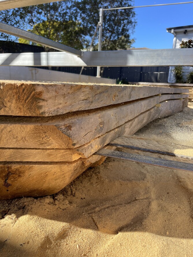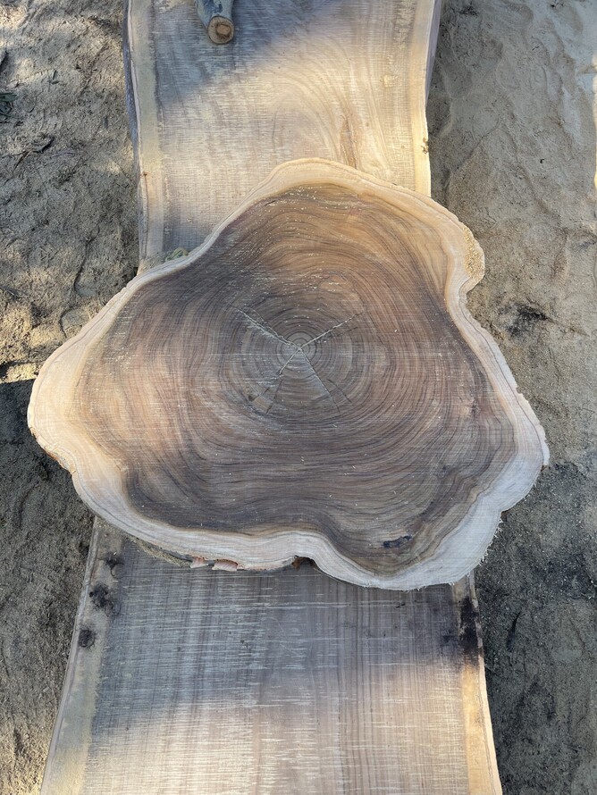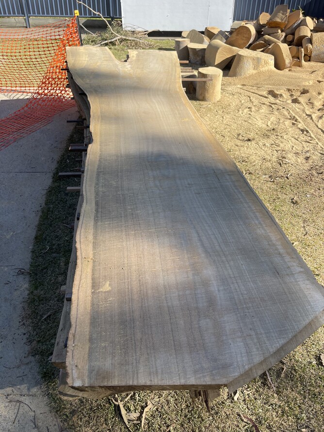 We were able to slab the majority of the trunk into 10 slabs at 70mm thick to be used for tables, the remaining round was cut into sections to be used for bench seats. There was also a large round that the customer asked us to cut into two to be used for coffee tables. The branches of the tree had been cut into smaller sizes that the customer was going to use as stump seating around the grounds and the rest became firewood for the community.
